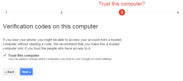 - The next question that Google will ask you is to confirm that your current machine is a trusted system like your home desktop, so it won’t ask you for 2 step verification whenever you are on that system. Else, you will get the alerts.